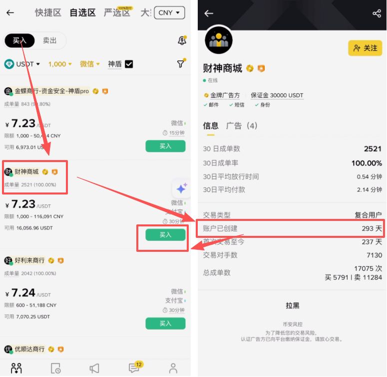 下面這些就是符合條件的商家了,我們就可以去選擇一個商家去跟他交易。選擇商家首先我們要看他的成單量和成交率都是越高越好。然后點開他的主頁,查看一下他的賬戶已創(chuàng)建時間,越久越好,至少要是半年以上的。因為他的賬戶存活的時間越久就證明他的資產(chǎn)越安全,交易了這么長時間以來,沒有出現(xiàn)過什么問題。確認跟他交易之后我們點擊【買入】。