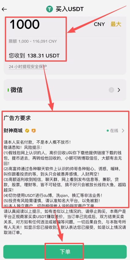 這里給我們計算出我能收到138.31個U,下方這里有一個廣告方的要求,我們查看一下,想要讓交易順利的進行,我們就必須按照商家的要求去做,比如說我們一定要實名付款。點擊【下單】。