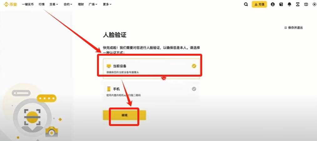 接下來就是人臉驗證環(huán)節(jié)。如果你的電腦有攝像頭的話,用“當(dāng)前設(shè)備”的攝像頭直接進(jìn)行人臉驗證?;蛘呖梢赃x擇第二種方式用手機(jī)掃描二維碼,在手機(jī)上完成人臉驗證。我這里選擇“當(dāng)前設(shè)備”,點擊繼續(xù)。