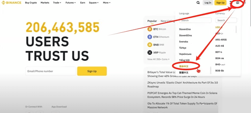這樣我們就來到了幣安的注冊頁面。對于不熟悉英文界面的小伙伴,可以點擊右上角的“地球”,選擇簡體中文,切換到中文語言。