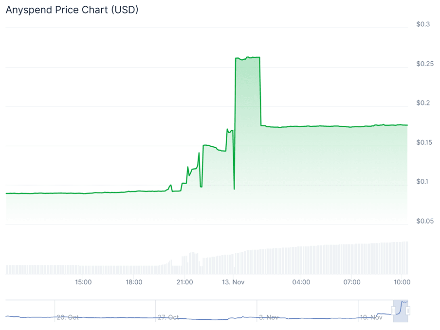 在撰寫本文時(shí),Anyspend 的交易價(jià)格約為$0.1761,在一天之內(nèi)增長了近97%。