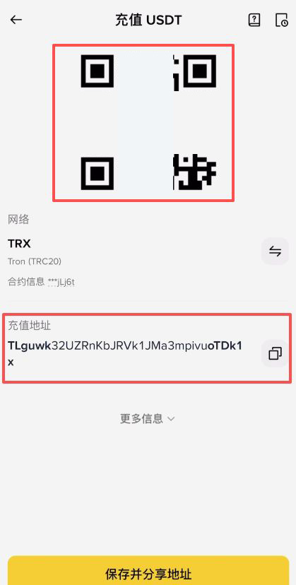 點(diǎn)進(jìn)來之后就會(huì)出現(xiàn)我們的充幣地址了,這里有一個(gè)二維碼我們可以直接保存下來。下面的充值地址我們也可以選擇復(fù)制。這樣把我們的地址發(fā)給別人,別人就能夠通過這個(gè)地址來給我們轉(zhuǎn)賬了。