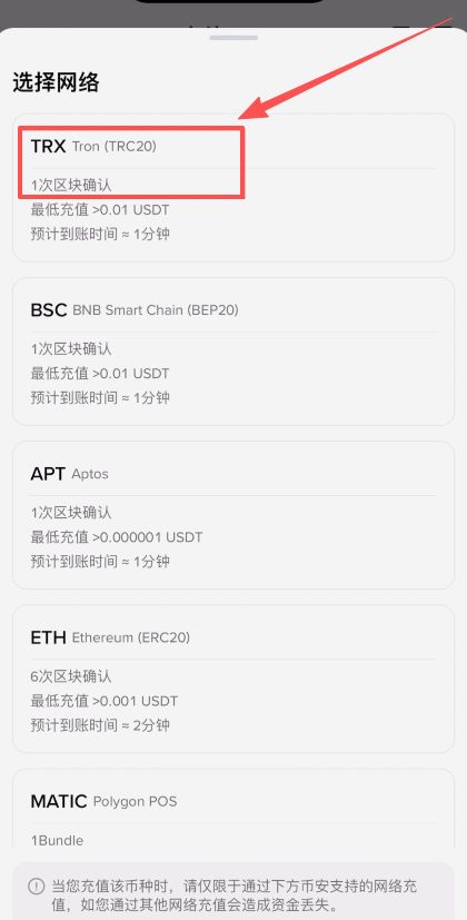 然后就需要我們選擇網(wǎng)絡(luò)了,常見的鏈就是TRX,也就是TRC20這條鏈。