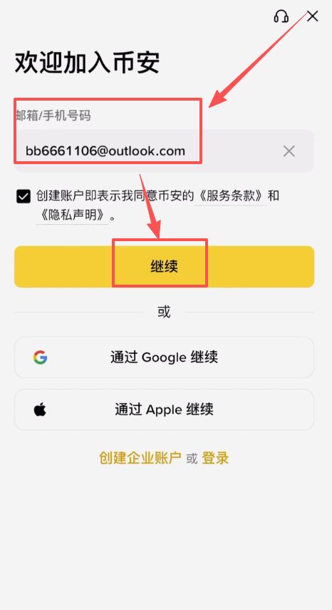 來到注冊頁面之后,幣安允許我們使用郵箱和手機號碼進行注冊。我這里就輸入進我的郵箱,點擊【繼續(xù)】。