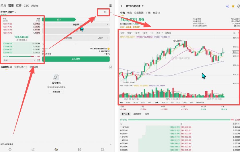 最基本的也是最常見的就是現(xiàn)貨交易。這個很好理解顧名思義,就是你現(xiàn)在的價格買進一個幣,然后就拿著它,盼著它未來能漲價。接下來我們就以幣安為例,演示一下比特幣和USDT的現(xiàn)貨交易。