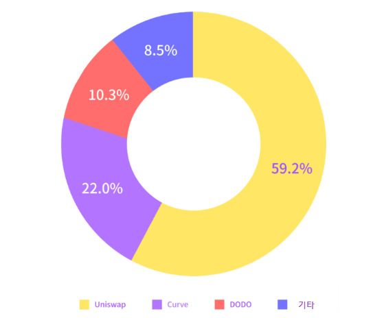 在去中心化交易所(DEX)中,Uniswap 市場份額最大,為 59.2%,其次是 Curve,市場份額為 22.0%,DODO 位列第三,市場份額為 10.3%。