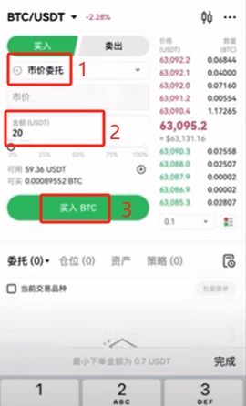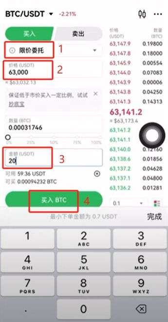 限價(jià)委托就是我們來報(bào)另一個(gè)價(jià),必須得跟這個(gè)價(jià)格差不多的時(shí)候才能夠成交。比如現(xiàn)在價(jià)格是64500,我們想以64000的價(jià)格來進(jìn)行購(gòu)買。就輸入64000,輸入要購(gòu)買的數(shù)量或者是金額,點(diǎn)擊【買入BTC】。