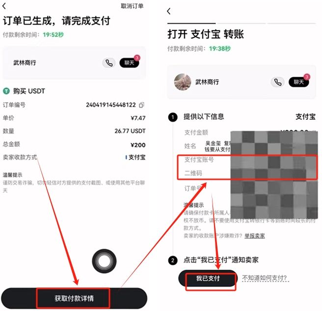 點(diǎn)擊下方的【獲取付款詳情】,根據(jù)商家提供的支付方式給他轉(zhuǎn)錢,你可以根據(jù)他的支付寶賬號(hào)或者是他提供的二維碼給他付款。付完款之后,點(diǎn)擊【我已支付】,等待賣家核實(shí)收到錢之后,放幣給我們就可以了。