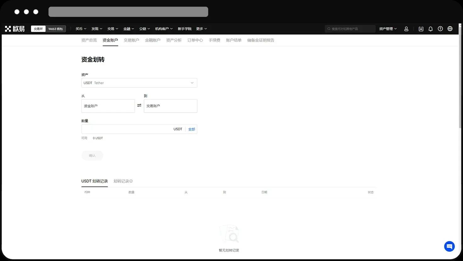 打開歐易 APP,點(diǎn)擊【資產(chǎn)】—【資金劃轉(zhuǎn)】,選擇幣種以【USDT】為例 — 從【資金賬戶】— 到【交易賬戶】— 輸入劃轉(zhuǎn)【數(shù)量】—【確定】。