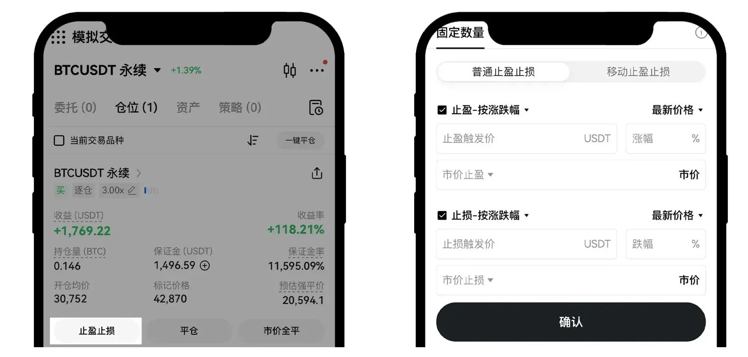 選擇具體要平的倉位點(diǎn)擊【止盈止損】 — 輸入【止盈觸發(fā)價(jià)格】、【止損觸發(fā)價(jià)格】、【數(shù)量】—點(diǎn)擊【確定】。