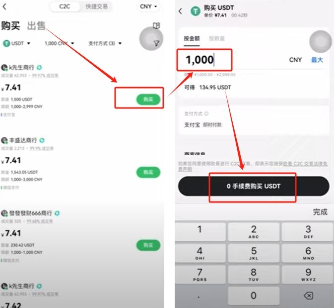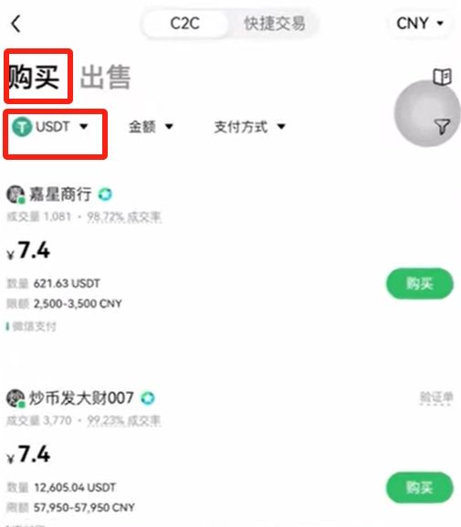 我們一般購買的時候,你也可以試一試快捷買幣,也可以選這個C2C交易。“C2C買幣”它以前叫做自選區(qū)。自選區(qū)顧名思義就是有特別多的廣告商,他們發(fā)布了自己的廣告,我們自己來進行挑選。“快捷買幣”就是你輸入你自己的金額,他自動幫你匹配,哪些賣USDT賣的最便宜的人,它就自動給你匹配上。所以快捷區(qū)他只是一個按照價格最優(yōu)的邏輯進行匹配的。不會單獨的看一些商家的訂單數和成交量等的這些指標,所以我們一般交易不用快捷買幣,都是用C2C買幣。