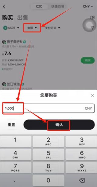 我們繼續(xù)看上面的功能。點擊“金額”,輸入一個我們想要購買的金額,比如說我們輸入個1000,點擊【確定】。他就會幫我們篩選出來支持我們購買1000的這些商家了。