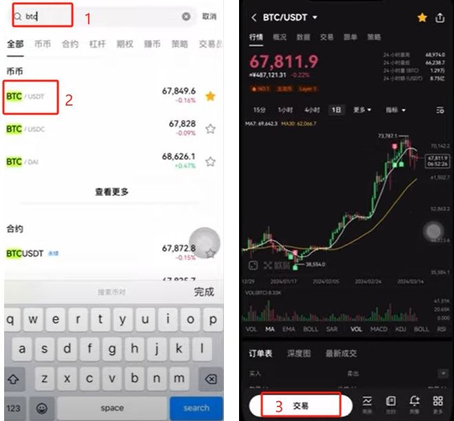 我們想買比特幣就可以回到首頁,在上方直接搜索“BTC”,這里給我們顯示出的第一個“BTC/USDT”就是比特幣的現貨交易對和USDT的交易對。直接點擊選擇它。再點擊左下角的【交易】。