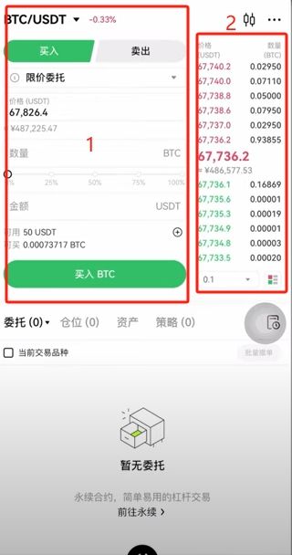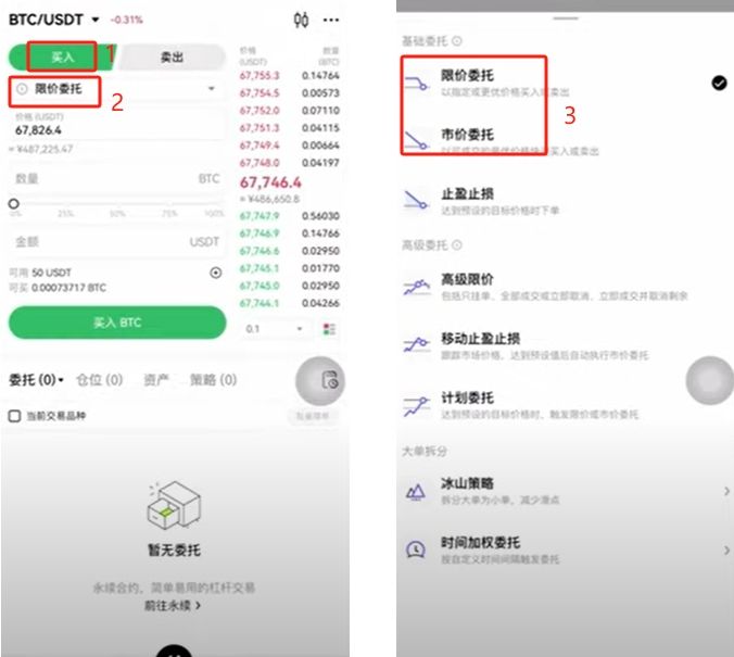 “限價委托”就是你限定一個價格,比如說你可以先定一個6萬,等比特幣的價格跌到6萬之后,它就自動成交。“市價委托”就是以市場最優(yōu)價來進行購買。這里就用市價委托來給大家做一個演示。
