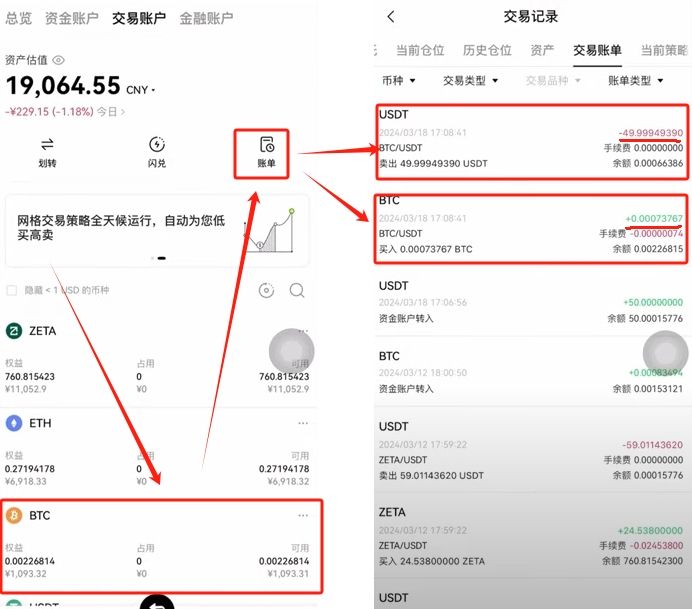 購買成功之后,在交易賬戶里面可以看到我們購買的比特幣。因為這里之前有一點點比特幣,所以不確定是不是自己買的。我們可以點擊右上角的【賬單】來查看交易記錄。你剛才購買的比特幣是用USDT購買的比特幣,花了49.999949個USDT。你能得到的比特幣在下方顯示+0.00073767個。下邊還有手續(xù)費、余額他都會一目了然的給你標記出來。