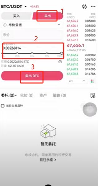 這次我們在上方選擇【賣出】,然后我們選擇市價委托或者限價委托都可以。這里我們還是選【市價委托】,拉動下方的滑輪到100%,點擊【賣出BTC】,這樣就賣出成功了。