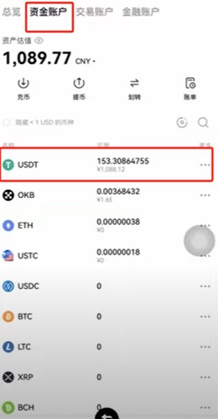 現在我們去看一看,我們購買的USDT在哪里。返回到主頁的位置,點擊右下角的【資產】,買完的幣是放在資金賬戶里面的。上方點擊【資金賬戶】,我們可以在這里看到有50個USDT在這里,我們買完就直接是在這里的。