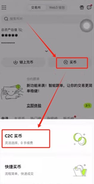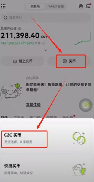 接下來我們點擊首頁右上角的【買幣】按鈕,選擇【C2C買幣】
