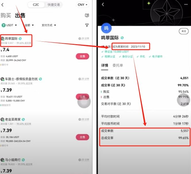 出金的過程你一定在別的文章里看到過,比如說我點擊一個人的圖標。進去看他的注冊時間夠不夠長,成交率高不高,成交單數多不多,這些確實非常有用。給大家?guī)讉€標準。首先一個成為商家的時間,最好是大于一年。下邊的成交單數和成交總率都是越多越好。