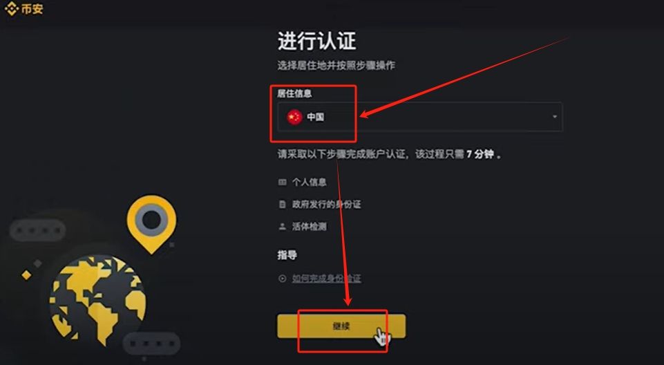 注冊完成之后,會自動跳轉(zhuǎn)到身份認(rèn)證的頁面。居住信息我們?nèi)鐚嵦顚懀x擇“中國”,點擊【繼續(xù)】。