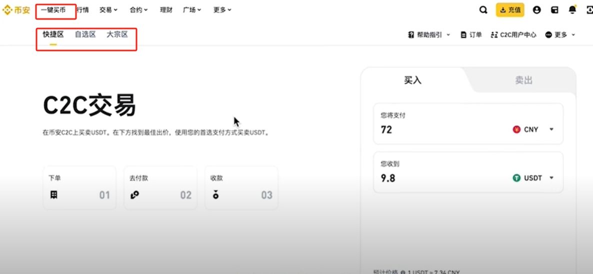 點擊左上角的【一鍵買幣】。這里就是幣安的C2C交易,里面有三種購買方式:快捷區(qū)、自選區(qū)、大宗區(qū)。