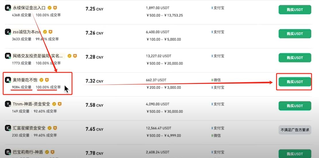 然后幣安平臺就會為我們篩選符合條件的商家,我們要找成交量和成交率多的商家來進(jìn)行購買。因為我們想買入,所以當(dāng)然想去買價格便宜的。比如我們來看“奧特曼吃不飽”這一家,它有一個9000的成交量,同時它的好評率也是100%,我們就可以跟他來進(jìn)行購買,點擊后方的【購買USDT】。