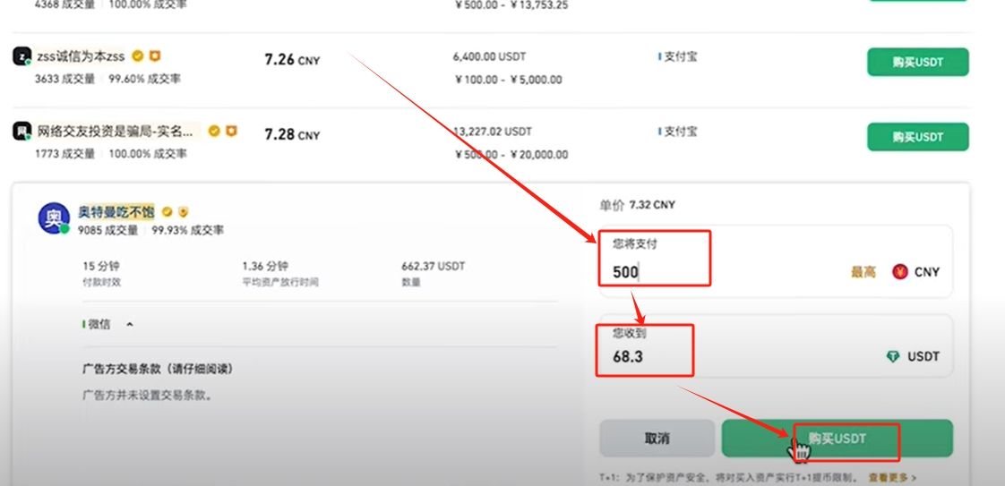 再次輸入一下你要購買的金額,下方它會自動為我們算出來,支付500人民幣將收到68.3顆USDT,點擊【購買USDT】。
