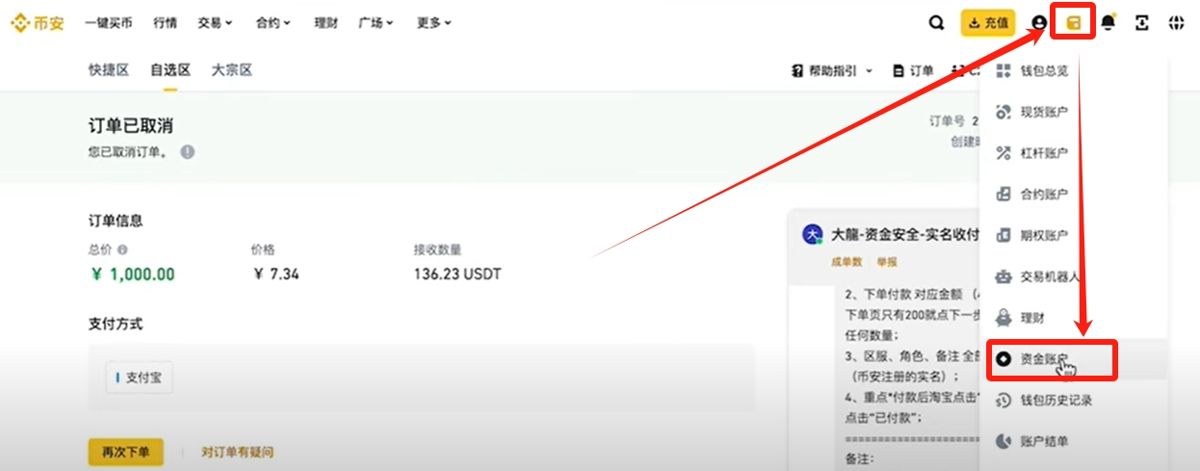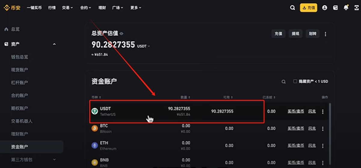 我們買好的USDT都會在資金賬戶里面。點擊右上角的小錢包,找到【資金賬戶】