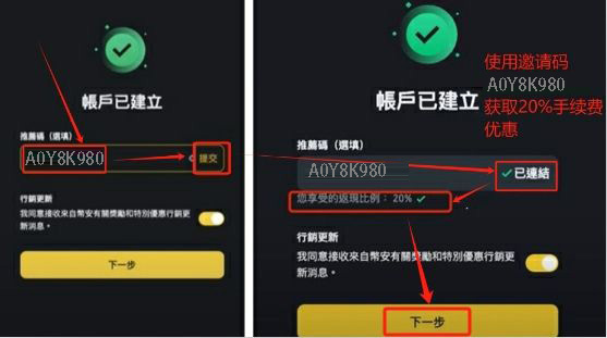 創(chuàng)建完密碼之后,會直接到填寫推薦碼的地方。如果你使用上方鏈接注冊的話,這里會自動為你填寫好。如果沒有填寫,可以輸入A0Y8K980,點擊旁邊的【提交】按鈕進(jìn)行綁定。綁定成功之后,你的返現(xiàn)比例就有了20%。也就是說,你這個賬號就是一個永久手續(xù)費8折的賬號了。點擊【下一步】。