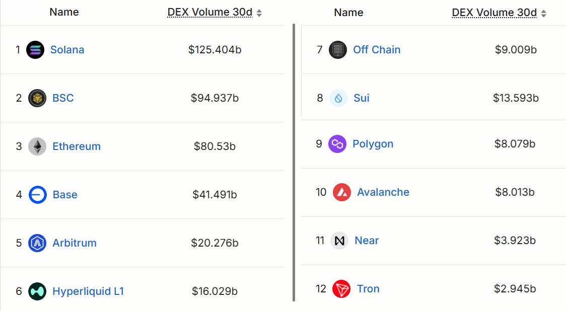 按30天DEX交易量排名的區(qū)塊鏈,美元。來源:DefiLlama