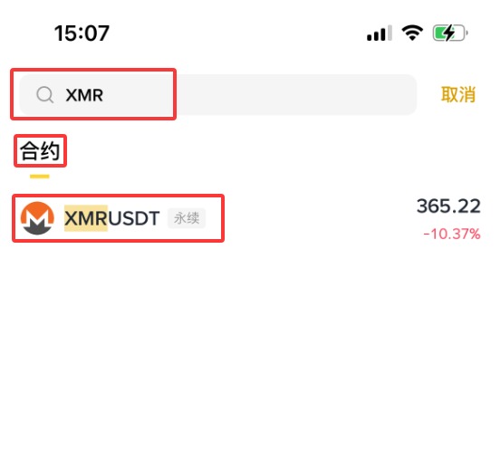 3、輸入【XMR】,這時下拉會顯示合約XMR USDT,點擊【XMRUSDT】。