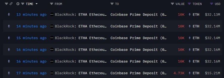 與黑石集團(tuán)及亞瑟·海斯(Arthur Hayes)相關(guān)的大額以太幣轉(zhuǎn)帳已成為當(dāng)今市場討論的核心。 X 上的分析師分享了顯示一系列大量以太幣存款的圖像,這些存款從標(biāo)注為黑石集團(tuán)的錢包轉(zhuǎn)移到Coinbase Prime。這些轉(zhuǎn)帳在幾分鐘內(nèi)相繼發(fā)生,每筆轉(zhuǎn)帳大約為一萬以太幣,價值略高于三千二百萬美元。