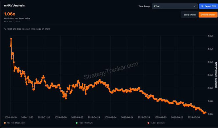 MSTR 的 mNAV 已經(jīng)要跌到1以下了。