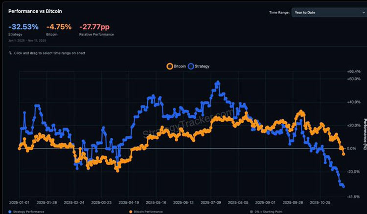 從今年年初算的話,BTC只跌了4.75%,但MSTR股價已經(jīng)跌了32.53%。