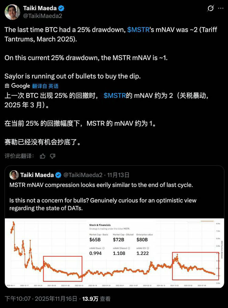 但當 BTC 大跌,加上mNAV跌破1,這個循環(huán)就沒有以前那么絲滑了。