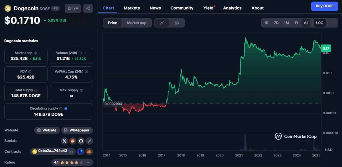 Dogecoin 在 2021 年 5 月曾漲至每枚約 0.73 美元的歷史最高點(diǎn),當(dāng)時(shí)正處于社交媒體熱潮以及 Elon Musk 的頻繁提及所帶來的最高人氣階段。之后價(jià)格回落,并且直到現(xiàn)在都尚未回到此前的歷史高位。