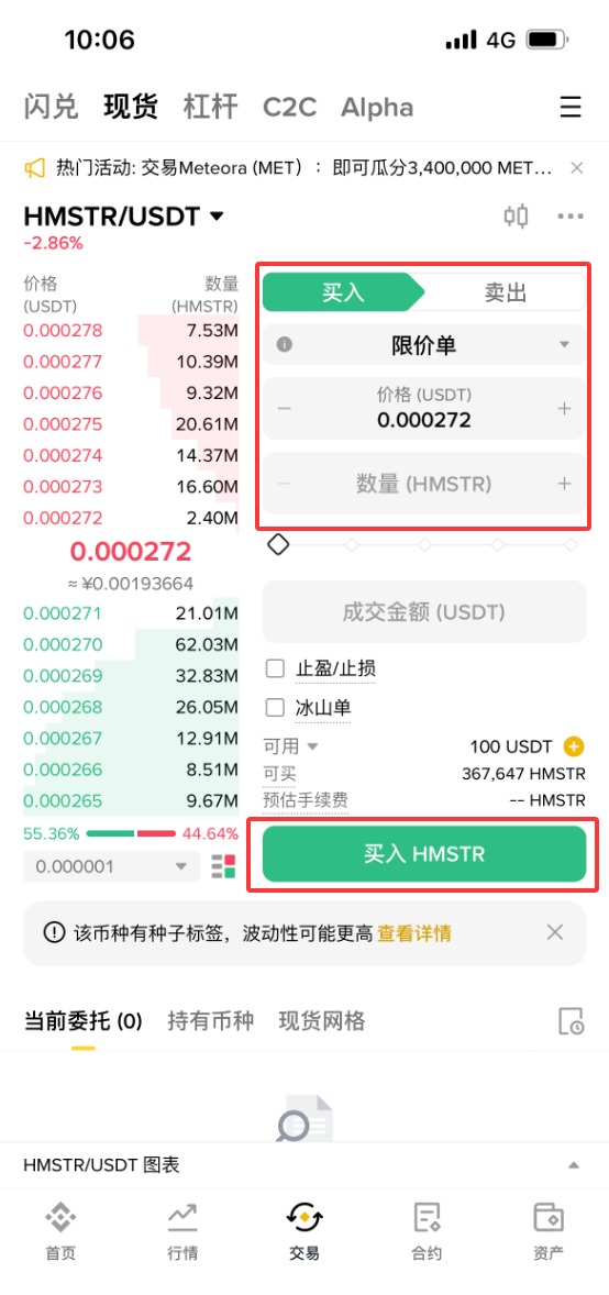 5、依次選擇【限價(jià)單】-購(gòu)買【價(jià)格】-購(gòu)買【數(shù)量】-【成交數(shù)量】,設(shè)置好之后,點(diǎn)擊【買入HMSTR】。