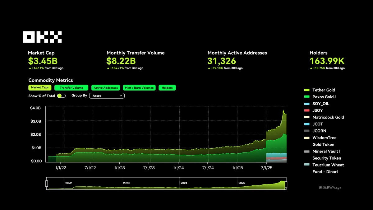 截至 11 月 10 日,當前 RWA 領(lǐng)域的大宗商品類代幣呈現(xiàn)出顯著的增長態(tài)勢,總規(guī)模從早期不到 10 美元逐步增長至約 35 億美金、月交易量達 82.2 億美金、月活躍地址數(shù)為 31,326 個、持有者數(shù)量為 16.4 萬。尤其是黃金類代幣表現(xiàn)突出,石油和大豆等大宗商品代幣化資產(chǎn),近期呈現(xiàn)加速上漲趨勢,整體市場活躍度和規(guī)模都在快速擴張。