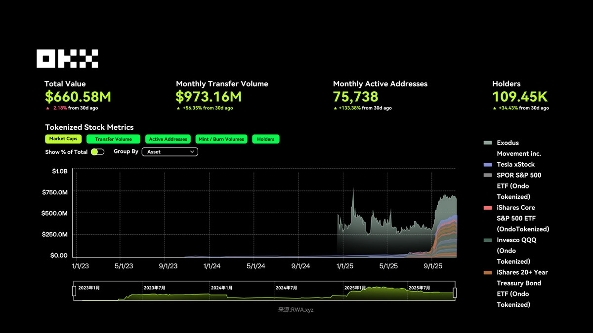 截至 2025 年 11 月 10 日,上市股票總鎖倉價值為約為 6.61 億美元、月交易額達 9.73 億美元(環(huán)比 +56.35%),活躍地址 75,738(環(huán)比 +133.38%),持有者總數(shù)突破 10.9 萬(環(huán)比 +34.43%),總體看用戶參與度與交易熱度正在持續(xù)回升,市場正在迎來一輪新的增長周期。