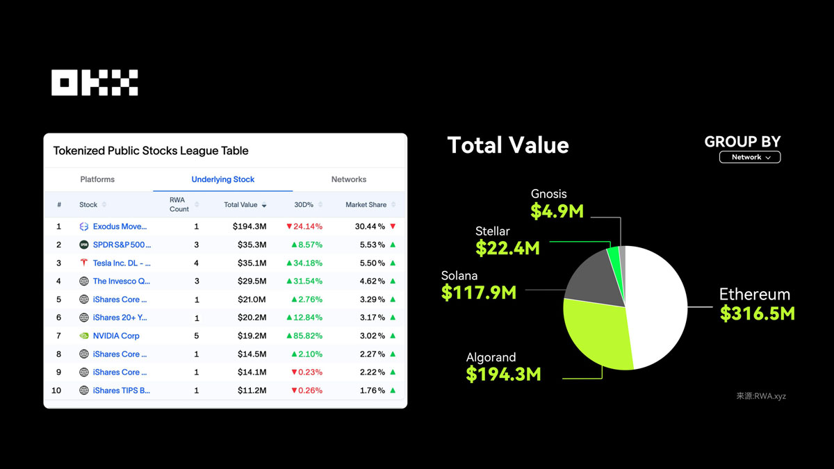 從資產(chǎn)結(jié)構(gòu)上看,目前代幣化股票的核心還是科技股和 ETF 產(chǎn)品,市場高度集中在幾個頭部項目里。比如,Exodus Movement Inc. (EXOD) 以 1.94 億美元 的總價值穩(wěn)居第一。2025 年 10 月 20 日,Exodus 宣布通過 Superstate 的發(fā)行平臺,把普通股代幣擴展到 Solana 上(此前主要運行在 Algorand 鏈),成為「原生鏈上股票」的代表案例,也說明合規(guī)型股權(quán)代幣化正在從概念走向落地。