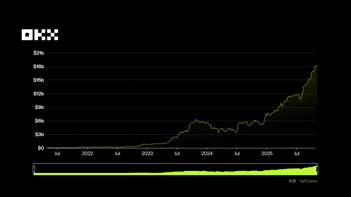 據(jù) DeFiLlama 數(shù)據(jù),全球 RWA 總鎖倉量 (TVL) 達 181.17 億美元,延續(xù)增長趨勢。(注:鏈上 RWA 總額統(tǒng)計的是所有鏈上發(fā)行的相關(guān)代幣總價值;而 TVL 特指存放在 DeFi 協(xié)議中作為抵押品或生息資產(chǎn)的 RWA 價值。很大一部分 RWA(如貝萊德的 BUIDL)被用戶直接持有在錢包里,并未存入 DeFi 協(xié)議,因此 TVL 會遠小于總發(fā)行額。)