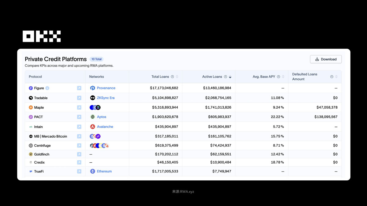 截至 2025 年 11 月 7 日,RWA 領(lǐng)域私募信貸活躍貸款規(guī)模約 186.6 億美元,平均年化利率 9.79%,總貸款筆數(shù) 2,710 筆。Figure 平臺占據(jù)約 92% 市場份額,貸款總額達 172 億美元;Centrifuge 通過多鏈架構(gòu)與 DeFi 協(xié)議互通,TVL 從 3.5 億美元增長至 13 億美元以上,歷史年化收益率 8%-15%。
