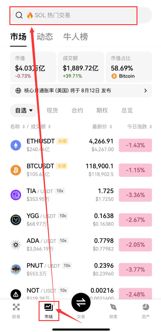 2、注冊完成之后,下面打開OKX app(官方下載),點(diǎn)擊【市場】上方的搜索框;