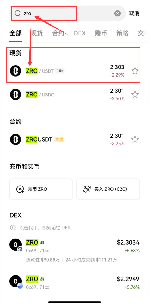 3、在搜索框里輸入【ZRO】,這時(shí)下方會出現(xiàn)ZRO/ USDT,選中它。