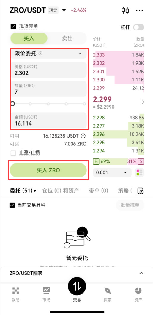 5、選擇合適的價(jià)位或數(shù)量購買,新手依次選擇【限價(jià)委托】、【設(shè)定價(jià)格】、【數(shù)量】、【金額】,最后點(diǎn)擊【買入ZRO】按鈕,就完成了。
