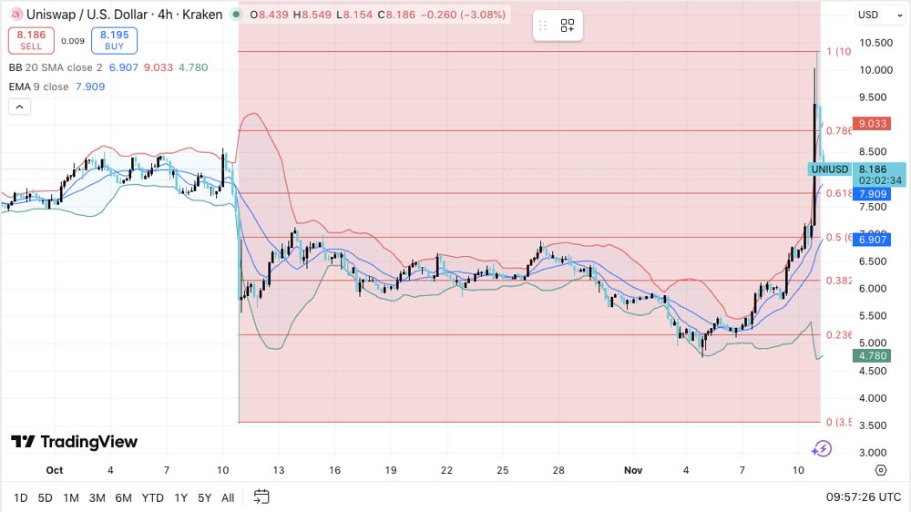 在 4 小時(shí)圖上,UNI 仍遠(yuǎn)高于其 20/50/100/200 EMA 簇,20 EMA 目前在 7.33 美元處提供即時(shí)支撐。布林帶顯著擴(kuò)張,表明 Uniswap 價(jià)格波動強(qiáng)勁,但當(dāng)前 K 線圖顯示上影線在 8.75 美元附近出現(xiàn)回落,暗示價(jià)格已出現(xiàn)疲軟。