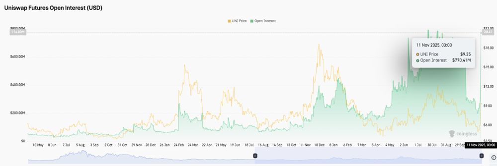 衍生品市場也顯示出交易活躍度上升的跡象。11月11日,Uniswap期貨未平倉合約量大幅攀升至7.7041億美元,表明在經(jīng)歷了數(shù)月的交易低迷之后,交易員的參與度有所回升。