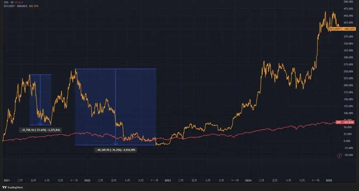 我將比特幣與 S&P 500 指數(shù)的走勢(shì)拉出來(lái)比較: