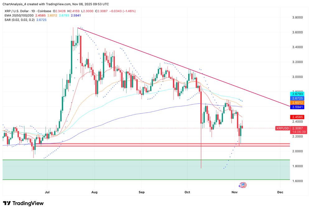 日線圖顯示,XRP 被困在一條從年內(nèi)高點(diǎn)延伸而來的清晰下降趨勢(shì)線下方。每一次試圖突破該趨勢(shì)線的嘗試都立即遭到拒絕,包括最近一次在 2.45 美元的嘗試。