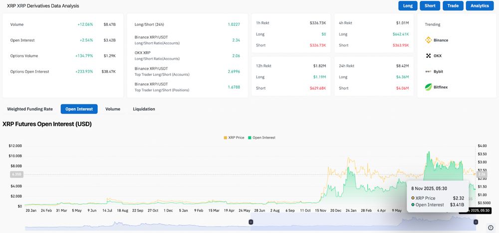 今年早些時(shí)候,XRP期貨未平倉合約量飆升至80億美元以上,隨后在10月下旬穩(wěn)定在42.1億美元。這一增長凸顯了強(qiáng)勁的投機(jī)活動(dòng),表明交易員正在為更高的波動(dòng)性做準(zhǔn)備。